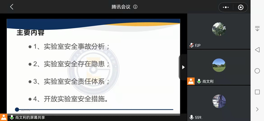 响应疫情防控号召,通过腾讯会议形式,给学院2021级全体新生举办了一场以“关注实验安全,共建平安校园”为主题的开放实验室安全讲座。学院党委书记陈泽龙、院长唐冬、副院长尚文利、副院长曾衍翰、党委副书记谢玲、综合办主任李玉、辅导员张虓,实验师冯锦澎、陈耀华、朱洁淇以及院办、学工办、实验室等相关老师参加了会议。